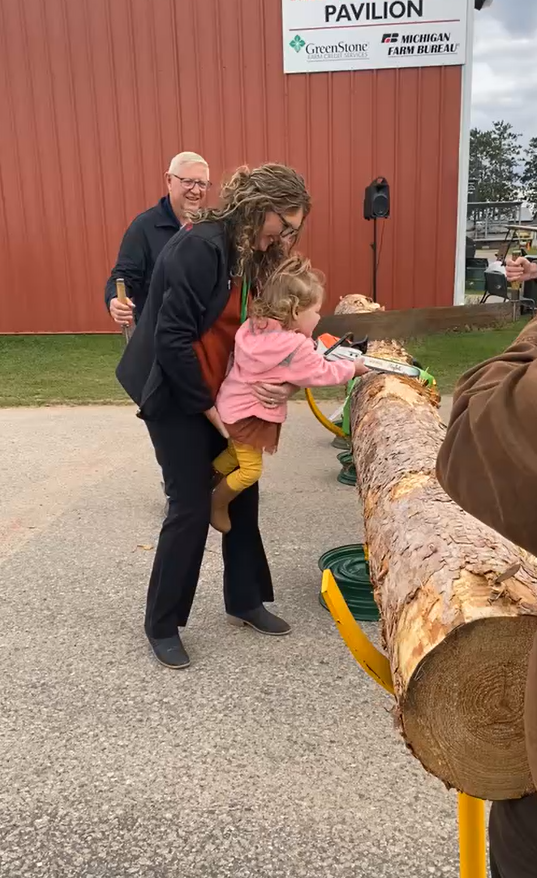 On Thursday evening the Opening Ceremony took place outside of the Miracle of Life Building and welcomed a special little girl named Everly, along with her family. Everly’s mother, Tricia, shared their experiences with Children’s Miracle Network hospital, Children’s Wisconsin, and told how the Log A Load For Kids program impacts patients and families like theirs. Then Everly and her parents took part in the ceremonial “Log Cutting”, which symbolizes the opening of the Expo. Immediately following was the annual Kickoff Event which featured Elmer’s famous catered dinner with pie and ice cream for dessert. There were wonderful bucket raffles and silent auctions with wonderful prizes donated from very generous exhibitors, businesses, and supporters of Log A Load For Kids. The evening raised a total of $7,064 which will be presented to seven different CMN Hospitals in Michigan and Wisconsin.