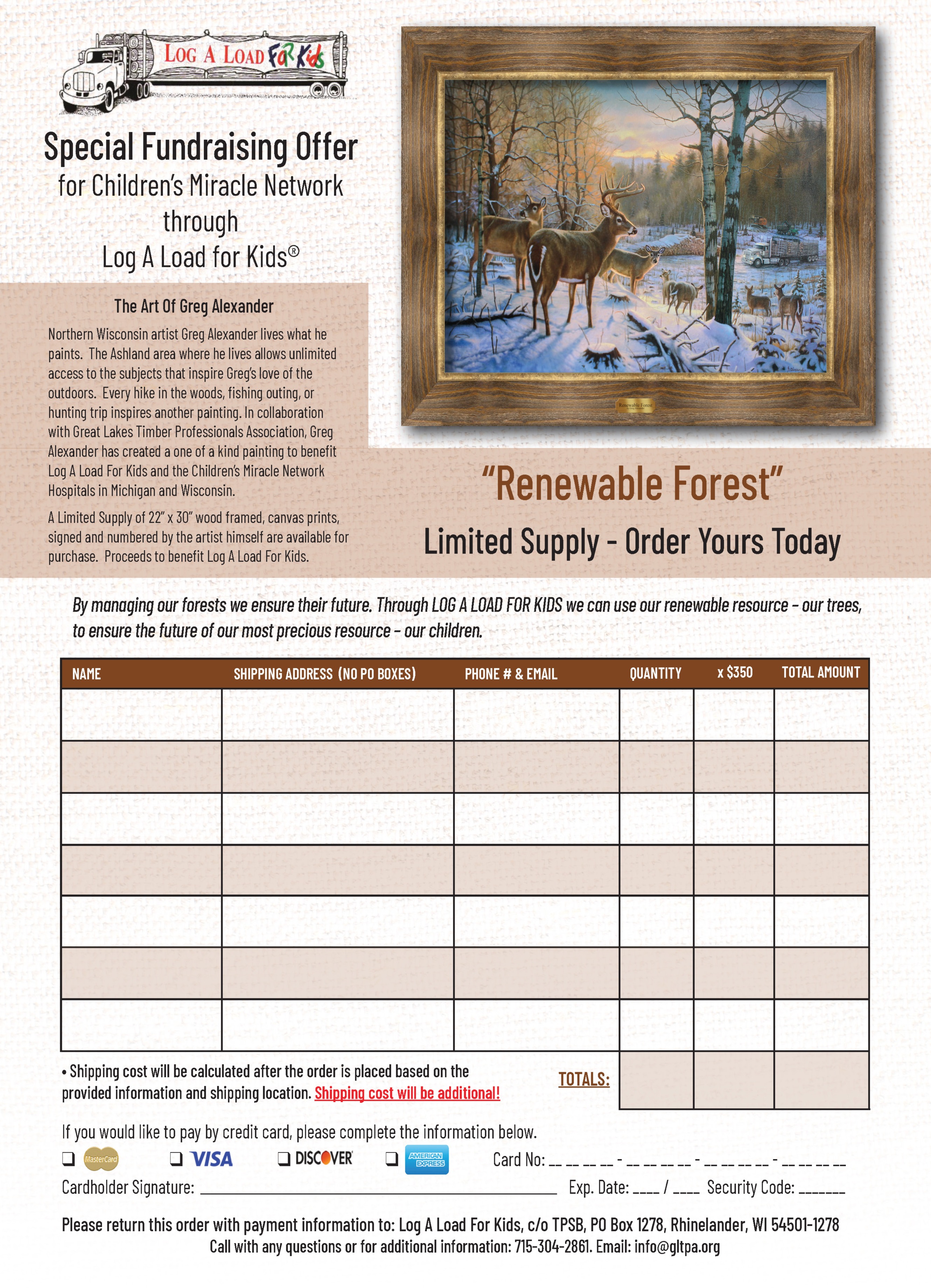 The Art of Greg Alexander: In collaboration with GLTPA, Greg Alexander has created a one-of-a-kind painting to benefit Log A Load For Kids and the Children's Miracle Network Hospitals in Michigan & Wisconsin. This beautifully wooden framed canvas print is signed and numbered by the artist himself. Order Yours Today! Call GLTPA (715) 304-2681
